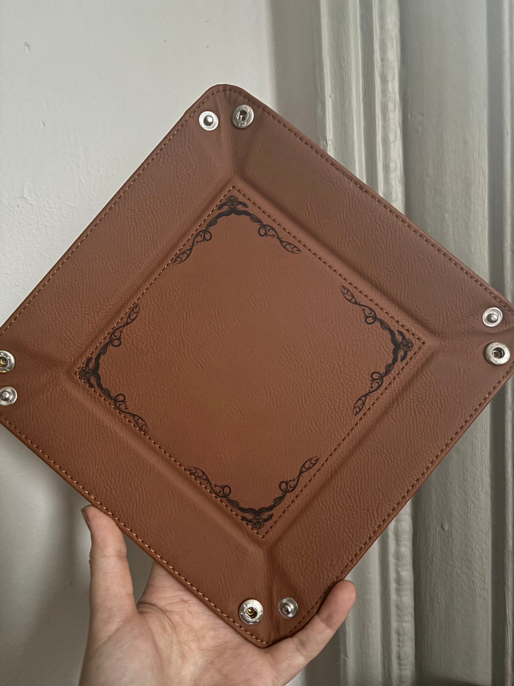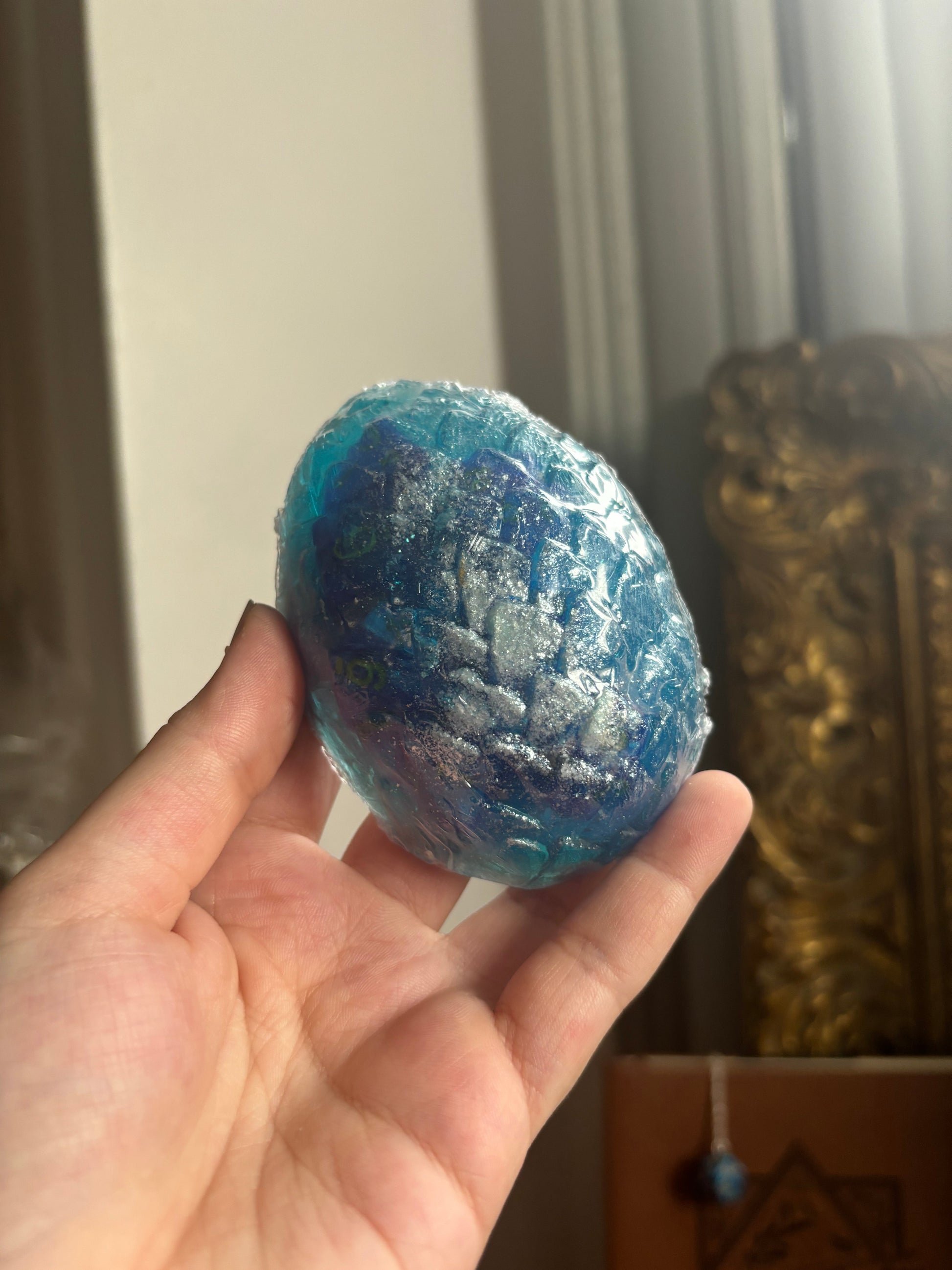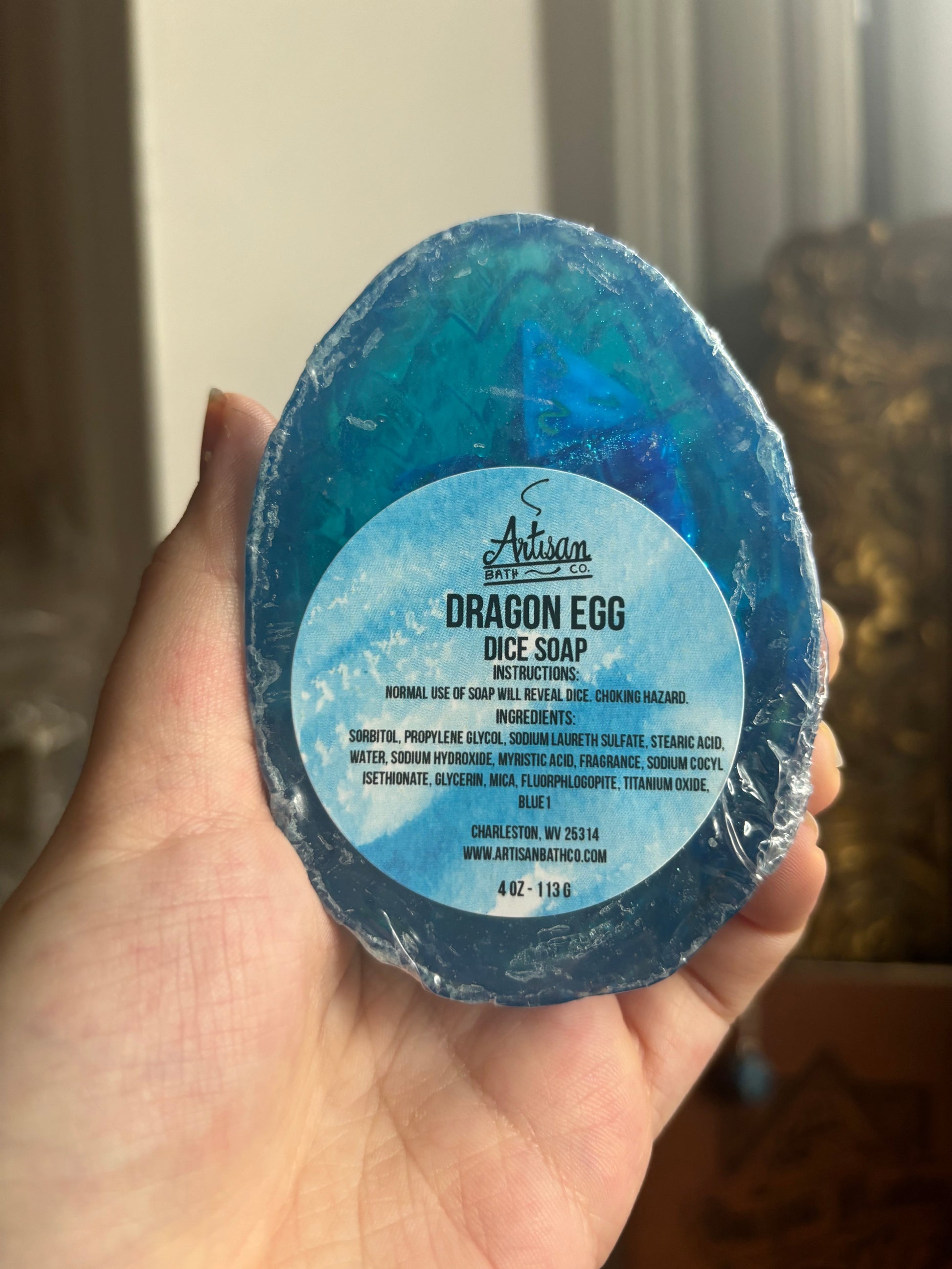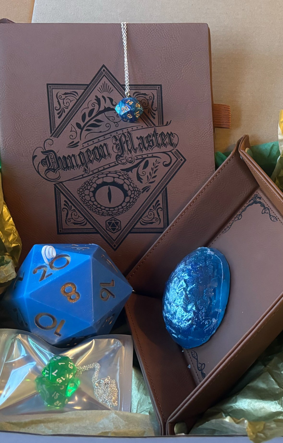 A gift box with all of the essentials for your favorite dnd player, fantasy fan, or table top game lover! Each box comes with a random colored d20 candle (with a die inside,) a random colored dragon egg soap with 7 dice inside, a dungeon masters journal, a dice tray, and a random colored d20 necklace!