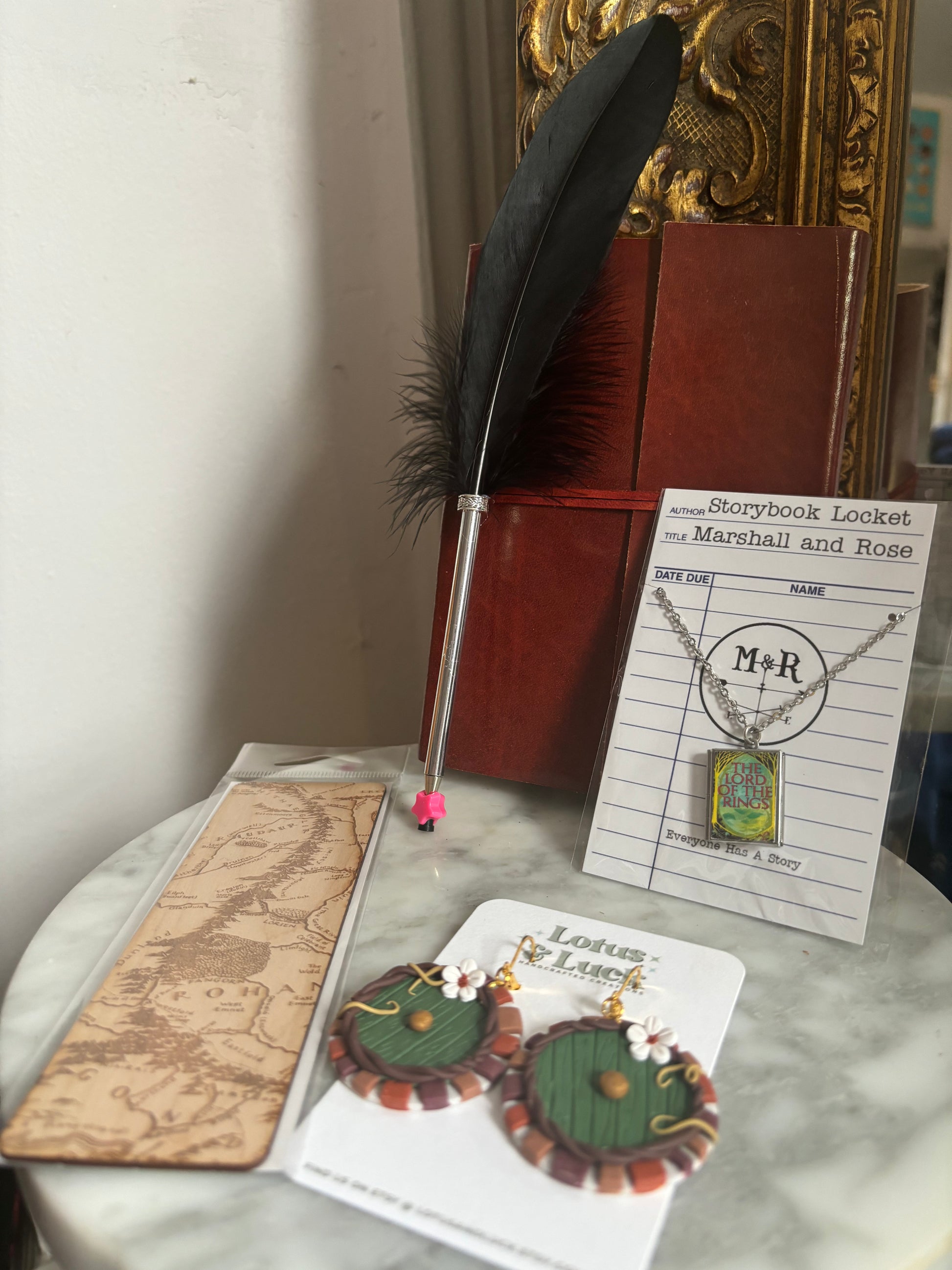 Gifts straight from The Shire! Each large gift box includes clay hobbit hole earrings, a lord of the rings locket, a feather pen, a handmade leather notebook, and a middle earth bookmark!